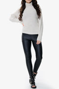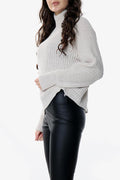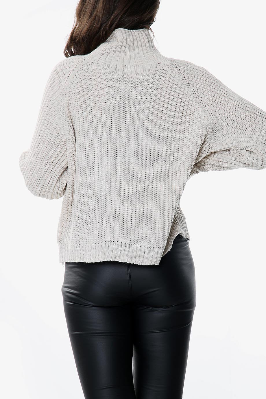 This beige knitted jumper features voluminous balloon sleeves and a high neckline, crafted from soft acrylic yarn for comfortable wear.