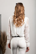 It includes long sleeves, delicate embroidery accents, and front button closures.
