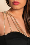 It features an asymmetric neckline with a beaded chain strap adorned with rhinestones and padded cups for added support.