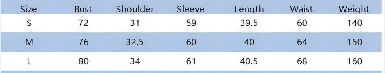 Size | Bust | Shoulder | Sleeve | Length | Waist | Weight (g) |